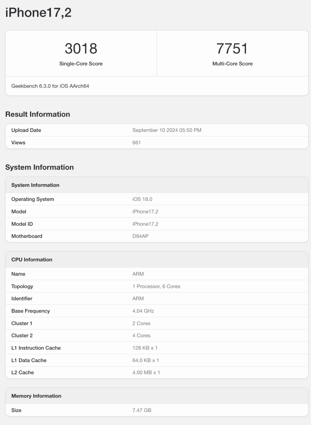 而型号为iPhone17,2的机型对应iPhone 16 Pro Max,同样是8GB运存,相比A18来说,搭载的A18 Pro多核成绩更高,具体单多核3018/7751。作为参考,上代8GB运存、搭载A17 Pro的iPhone 15 Pro系列单多核成绩大概2900±/7300±。
