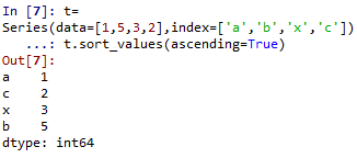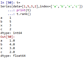第四个基本操作是排序与排名。如果要对Series的index进行排序,则语法为.sort_index,如果是对values进行排序,则语法为.sort_value,结果显示如下: