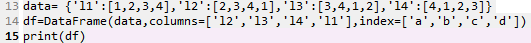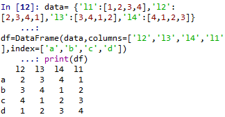 先将data数据独立,之后用DataFrame函数将data中的数据组引入,同时可以使用columns来调节数据组名字的顺序,得到如下的结果: