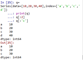 第三个基本操作是索引和切片,语法为obj[:],需要注意的是,由于pandas的index并不仅限于整数,当index为非整数时,切片是末端包含的,结果显示如下: