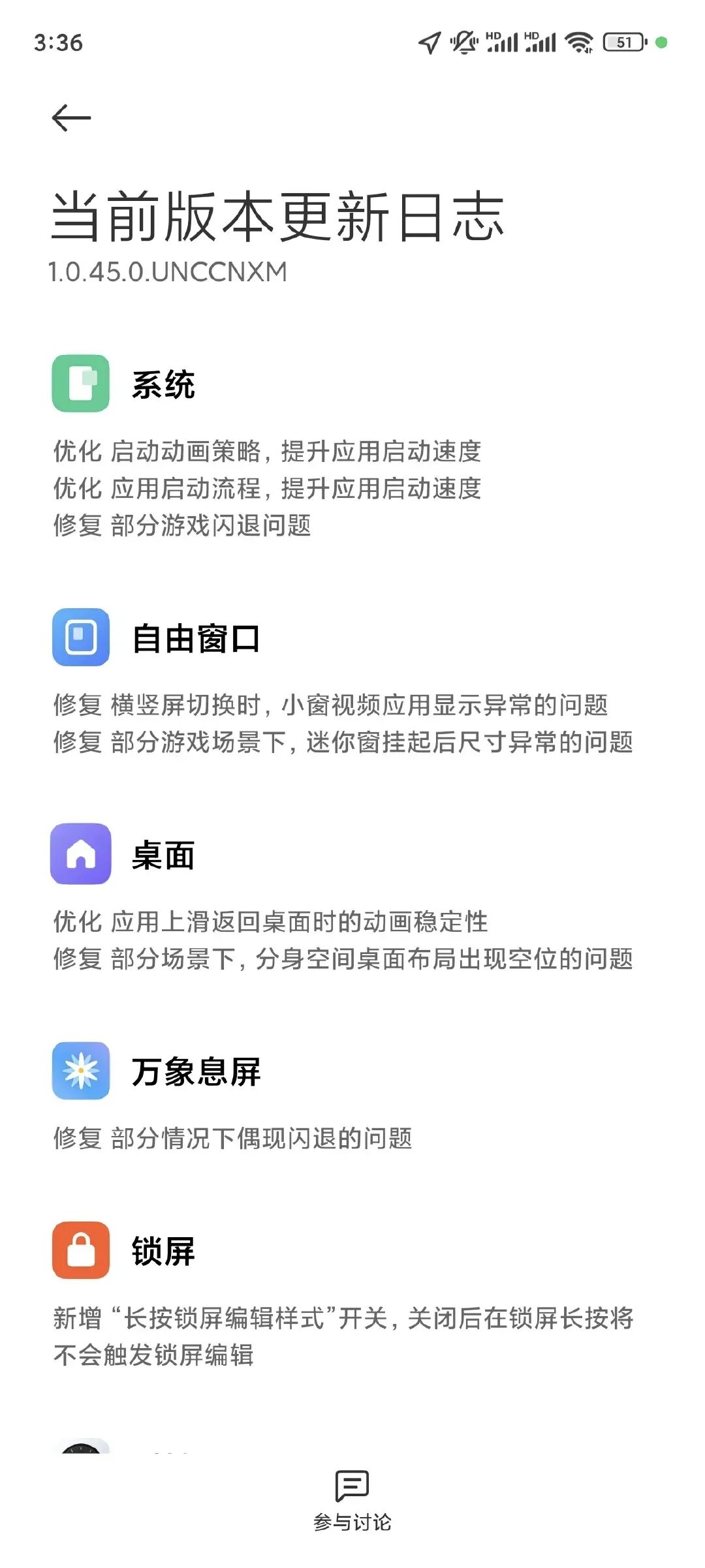 如上图所见,小米14最新版本Hyper OS 1.0.45.0主要更新内容为:优化启动动画策略,优化应用启动流程,提升应用启动速度,修复部分游戏游践闪退问题;修复自由窗口问题,提高桌面动画稳定性;万象息屏修复部分情况下偶现闪退的问题;锁屏新增“长按锁屏编辑样式”开关,关闭后在锁屏长按将不会触发锁屏编辑;修复闹钟设置重复周期时,切换深色模式出现勾选异常问题;