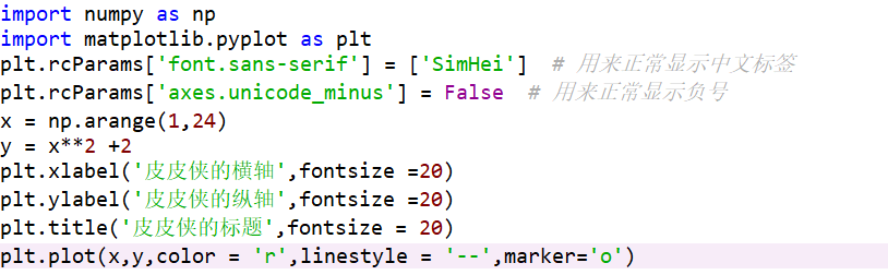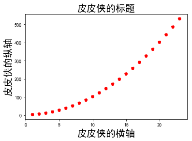 从结果可以看到,通过几个参数的引入,我们可以改变图内部线的形式以及颜色。除此以外,我们为图表添加上了标题,并且相较于之前的作图,我们调整了横轴以及纵轴标题字体的大小。标题的出现对应函数title()的添加。其余改变分别对应函数中所添加的几个新的参数。在xlabel(),ylabel()以及title()中,参数fontsize用来调整字体的大小,所填写的数字越大,在图中的字体大小越大。另外,参数color用来调整最后作图时图的颜色。