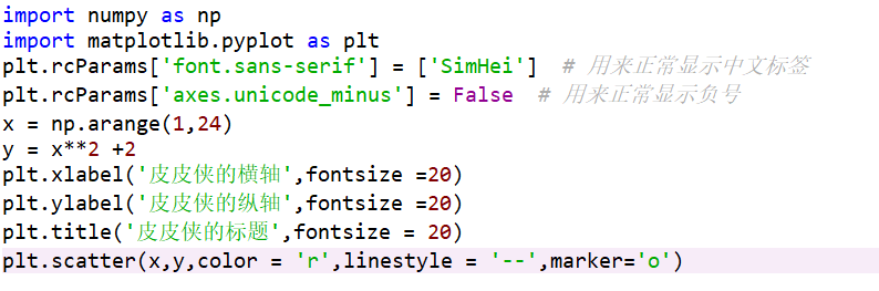 事实上,得益于python简洁的语法,要想做出相应的图,只需要一行代码的转变。如果想要画一幅三点图,我们只需将最后行代码调用的函数改为scatter()即可使原本的折线图变为散点图。