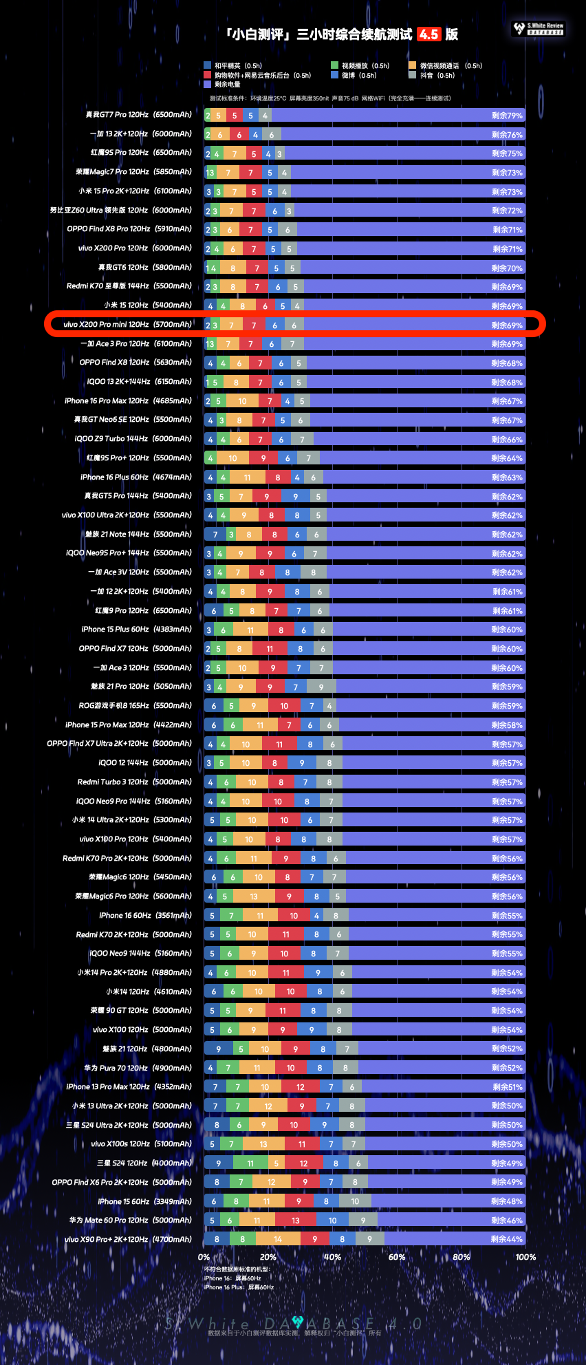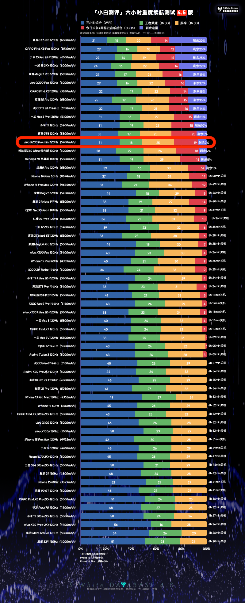 以上基于小白测评数据库4.5模型测试,环境温25℃±0.5℃,屏幕亮度350nit,声音75dB(游戏、六小时、测到关机:性能模式)(数据基于 vivo X200 Pro mini测试时最新版PD2419_A_15.0.16.7.W10.V000L1 系统测试)