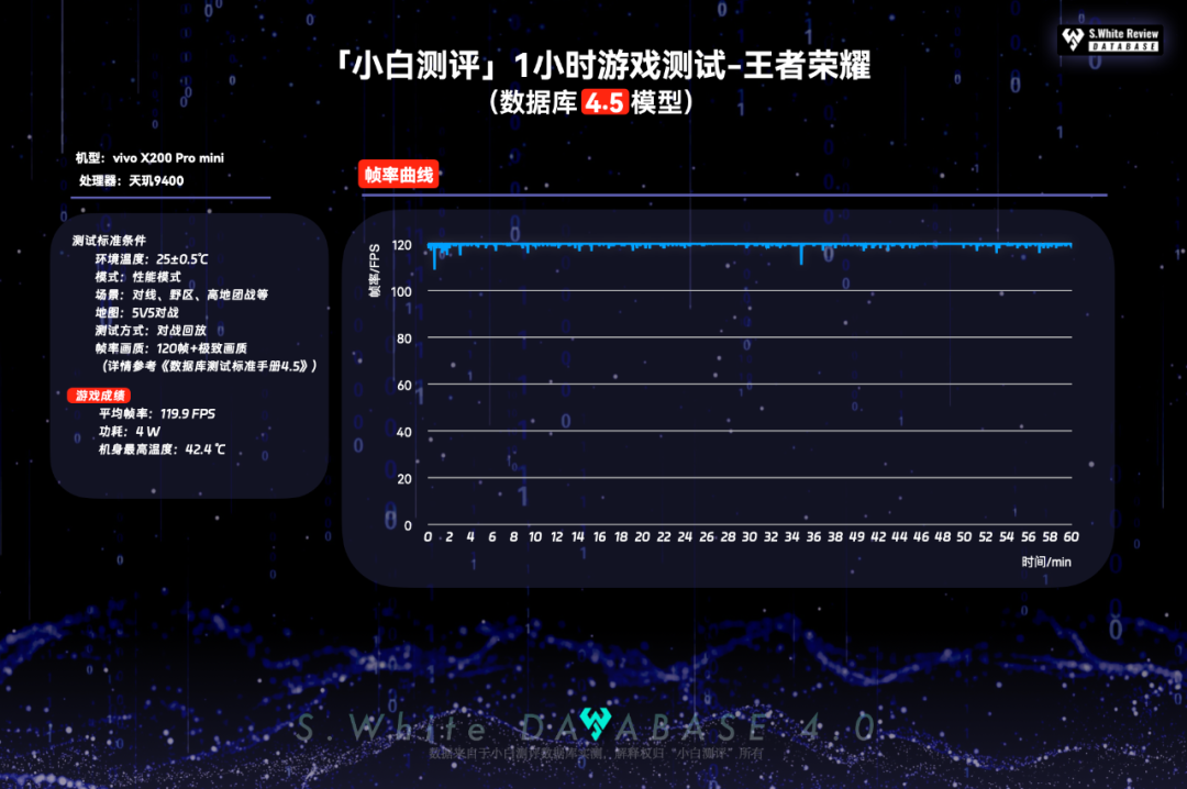 ①一小时《王者荣耀》:平均帧率119.9FPS,功耗4W,机身最高温度42.4℃;②《原神》(数据库4.5模型):平均帧率59.7FPS,功耗4.8W,机身最高44.5℃;③超高压场景《星穹铁道-黄金的时刻》:平均帧率58.1FPS,功耗6.7W,机身最高49.3℃。