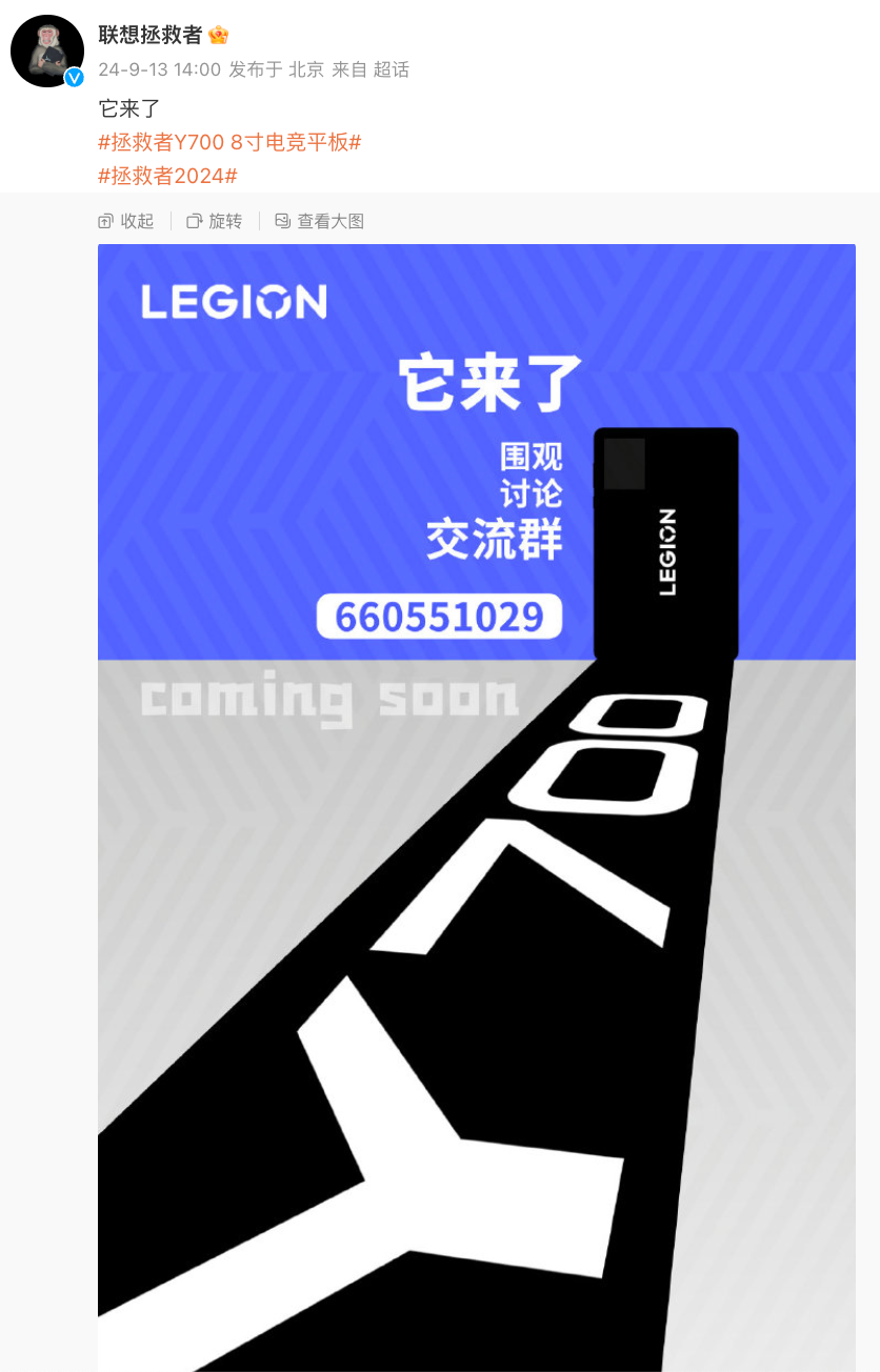 如上图所见,近日拯救者官方预热拯救者Y700 2024款Coming soon,依然是8英寸电竞平板。虽然暂未公布发布日期,但显然快了。