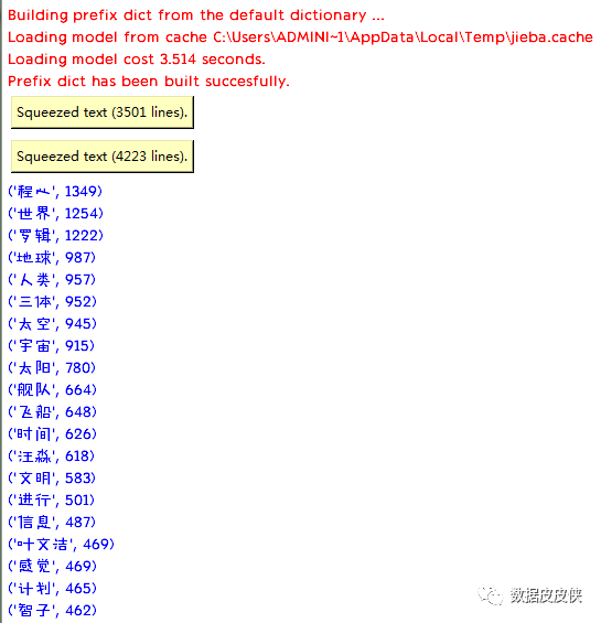 import jiebaimport os, sysimport jieba, codecs, mathimport jieba.posseg as pseg#3.txt= txt.load_txt()os.chdir(r'C:\Users\Administrator\Desktop')def get_text():f = open('三体.txt','r',encoding='utf-8').read()words = jieba.lcut(f)return wordswords = get_text()counts = {}dy= ['一个','没有','这个','可能','什么','知道','我们','他们','看到','已经','现在','自己','可以','就是','这样','不是','你们','那个','这种','只是','如果','出现','这里','开始','最后','一样','两个','起来','东西','只有','发现','这些','这是','还是','它们']for i in words:if len(i)==1:continueelse:counts[i] = counts.get(i,0)+1print(counts)for i in dy:del (counts[i])ls = list(counts.items())ls.sort(key= lambda x:x[1],reverse=True)print(ls)for i in ls[:20]:print(i)