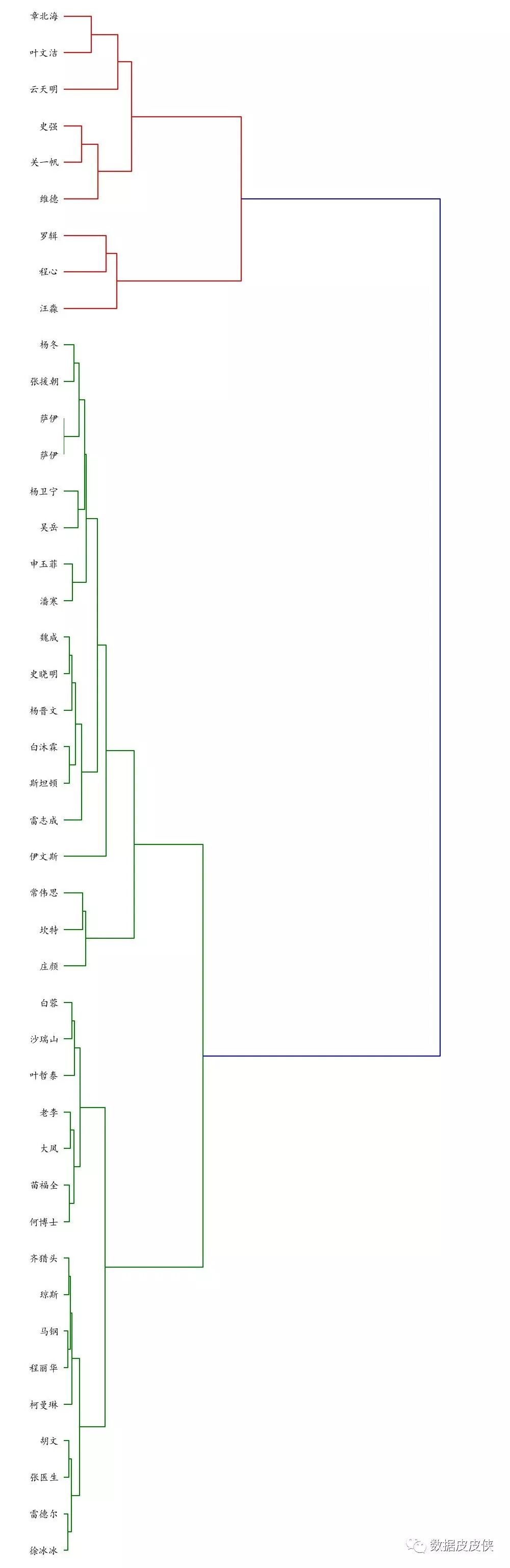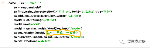 #参考文章‘利用Python简单品读小说’https://www.w3cschool.cn/python3/python3ilvp2z1w.# Python简单分析三体import gensimimport jiebaimport scipyimport numpy as npimport matplotlib.pyplot as pltimport scipy.cluster.hierarchy as hierarchyfrom matplotlib.font_manager import FontPropertiesfrom snownlp import SnowNLPimport osos.chdir(r'C:\Users\Administrator\Desktop')class easy_analysis():def __init__(self):print('[FUNCTION]:THREE BODY Analysis...')print('[Author]:RECO')# 词向量训练def training(self, text):with open(text, encoding='utf-8') as f:data = [line.strip() for line in f.readlines() if line.strip()]sentences = []for d in data:words = list(jieba.cut(d))sentences.append(words)model = gensim.models.Word2Vec(sentences, size=100, window=5, min_count=5, workers=4)return model# 给jieba添加关键词def add_key_words(self, words):for word in words:jieba.add_word(word)# 获得需要添加的关键词def get_key_words(self, text):with open(text, encoding='utf-8') as f:words = [line.strip('\n') for line in f.readlines()]return words# 返回d,a与b的关系和c与d的关系一样def get_relation(self, model, a, b, c):d, _ = model.most_similar(positive=[c, b], negative=[a])[0]print('{}和{}的关系类似于{}和{}的关系'.format(a, b, c, d))# 找主要人物def find_main_characters(self, text1, text2, num=10, title='Untitled'):with open(text1, encoding='utf-8') as f:text = f.read()with open(text2, encoding='utf-8') as f:character_names = [line.strip('\n') for line in f.readlines()]count = []for name in character_names:count.append([name, text.count(name)])count.sort(key=lambda x: x[1])_, ax = plt.subplots()frequency = [x[1] for x in count[-num:]]names = [x[0] for x in count[-num:]]ax.barh(range(num), frequency, color='skyblue',)font = FontProperties(fname="jt.ttf")ax.set_title(title, fontproperties=font)ax.set_yticks(range(num))ax.set_yticklabels(names, fontproperties=font)plt.show()# 层级聚类def hierarchy_(self, model, character_names):exist_names = []word_vectors = Nonefor name in character_names:if name in model:exist_names.append(name)for name in exist_names:if word_vectors is None:word_vectors = model[name]else:word_vectors = np.vstack((word_vectors, model[name]))np_names = np.array(exist_names)font = FontProperties(fname="jt.ttf")Y = hierarchy.linkage(word_vectors, method='ward')_, ax = plt.subplots(figsize=(10, 40))Z = hierarchy.dendrogram(Y, orientation='right')index = Z['leaves']ax.set_xticks([])ax.set_yticklabels(np_names[index], fontproperties=font, fontsize=14)ax.set_frame_on(False)plt.savefig('results.jpg')# plt.show()if __name__ == '__main__':ea = easy_analysis()ea.find_main_characters(text1='三体.txt', text2='人名.txt', title='三体')ea.add_key_words(ea.get_key_words('人名.txt'))model = ea.training('三体.txt')model.save('model')model = gensim.models.Word2Vec.load('./model')ea.get_relation(model, '程心', '罗辑', '叶文洁')ea.hierarchy_(model, ea.get_key_words('人名.txt'))ea.Get_Emotion('人名.txt')