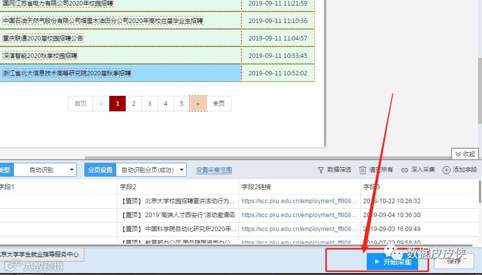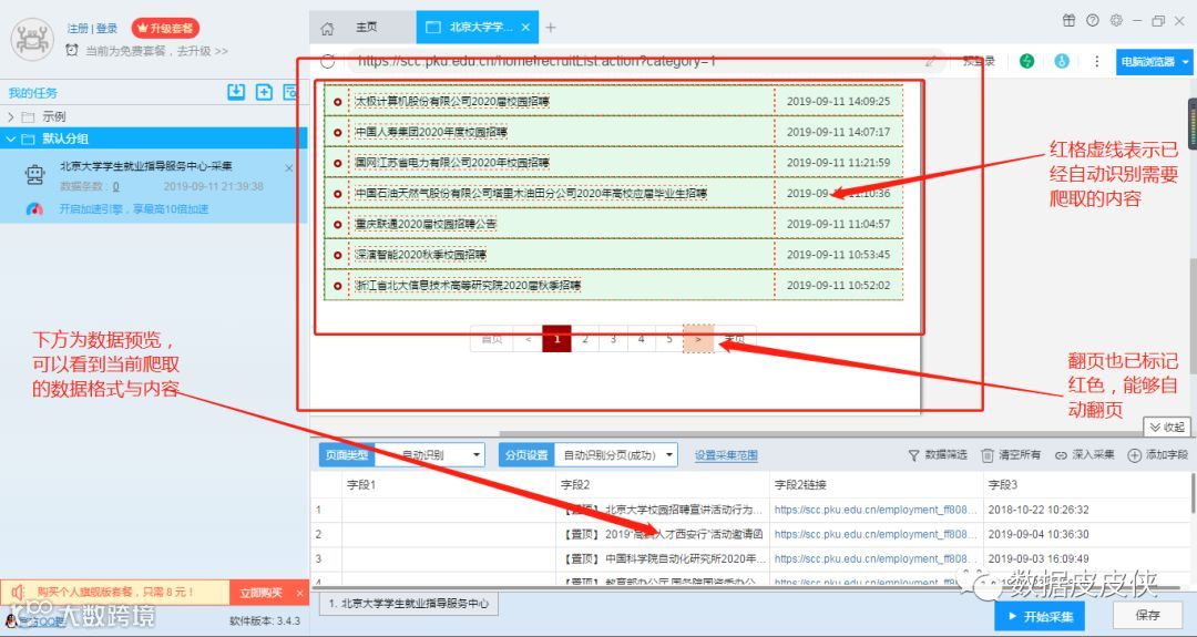 后羿采集器的智能模式采集只需要将你要爬取的页面放入网址框内,软件会自动识别出你可能需要爬取的内容。直接上例子,比如你要爬取某高校的就业网招聘信息(以北京大学为例),北京大学就业指导服务中心的网址为https://scc.pku.edu.cn/home!recruitList.action?category=1(我也不知道后面你看到的时候是否失效、有没有反爬虫,反正我可以用,我可以用,我可以用)。