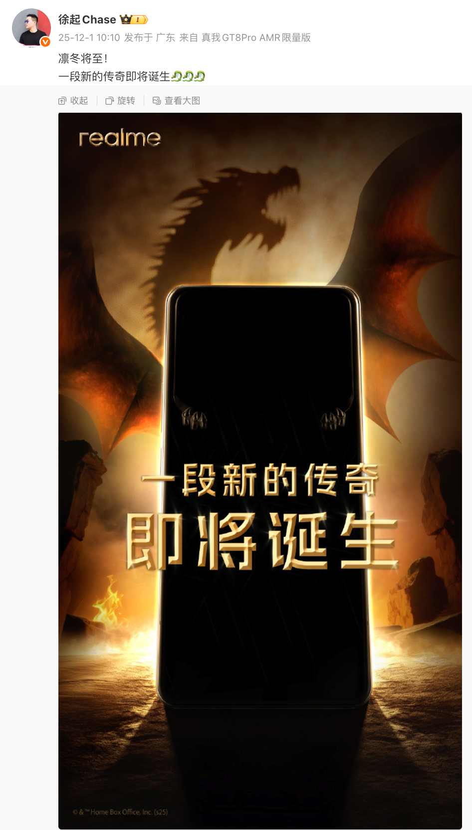 如上图所见,真我realme副总裁、中国区总裁徐起预热“凛冬将至!一段新的传奇即将诞生”,评论区猜测是权力的游戏联名产品,由于海报剪影是手机形状,猜测大概率或许就是此前海外部分市场已经发布的真我15 Pro《权力的游戏》限定版。