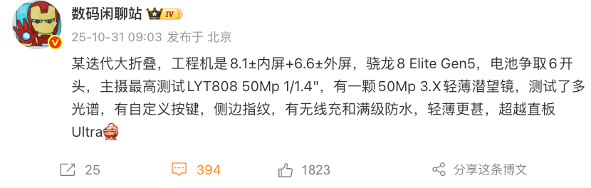 作为补充,Find N5主要配置有:6.62英寸外屏,8.12英寸内屏,内外屏均为1-120Hz刷新率,钛合金天穹架构(UTG超韧玻璃、晶盾超瓷晶外屏玻璃、超薄天穹复合纤维后盖、航空铝合金中框)、全新钛合金天穹铰链、超薄不锈钢主屏支撑结构,直边中框,侧边指纹,有三段式按键,展开时机身厚约4.21mm,重约229g,搭载7核CPU版骁龙8至尊版处理器,5600mAh,80W有线充、50W无线充,内外屏前置均为8MP,后置三摄①50MP主摄 ②50MP 3X潜望长焦 ③8MP超广角,支持红外遥控、NFC、USB 3.1 Gen2、双频GPS,配备双扬、X轴马达、IPX6/IPX8/IPX9防水、1TB版支持卫星通信等等。大家对新一代有什么期待?
