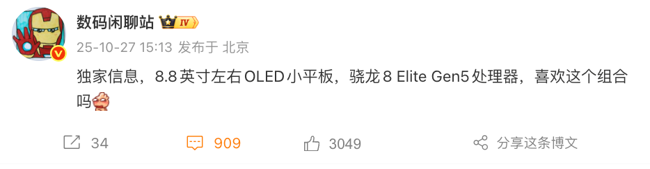 如上图所见,爆料达人数码闲聊站暗示OPPO的小平板新品将采用8.8英寸左右的OLED屏幕,搭载骁龙8 Elite Gen5最新旗舰处理器,屏幕还是单开的方案,似乎价格不便宜,大家喜欢这套组合吗?