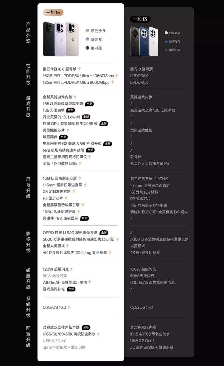 上图为官网列举的一加15和一加13主要配置对比表。