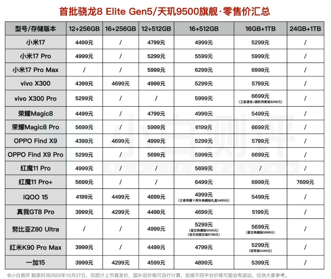 附上加上一加15后的所有目前已发布的骁龙8 Elite Gen5和天玑9500新旗舰价格表,iQOO、真我、红米、一加四台“子系”骁龙8 Elite Gen5新机你觉得哪台更值得入手?