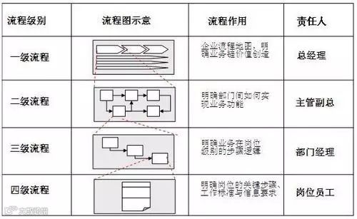 按照4级流程的划分,每级流程的作用与责任人有明显的差异,第一级,通常又称为企业流程地图,如电信行业的ETOM(Enhanced Telecom Operations Map)模型,第一级流程的负责人是企业总经理;第二级称为部门级流程,描述一个工作在不同部门之间是如何完成的,责任人是主管副总;第三级是岗位级流程,在岗位级别描述一个客户需求或内部需求是如何在部门内或企业内被完成的,责任人是部门经理;第四级是岗位内流程,着重于岗位内的表单与工作步骤等内容,责任人是岗位员工。