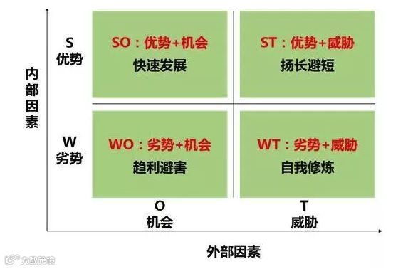 意义:帮您清晰地把握全局,分析自己在资源方面的优势与劣势,把握环境提供的机会,防范可能存在的风险与威胁,对我们的成功有非常重要的意义。