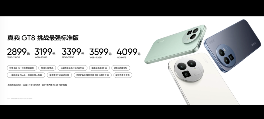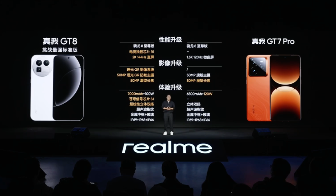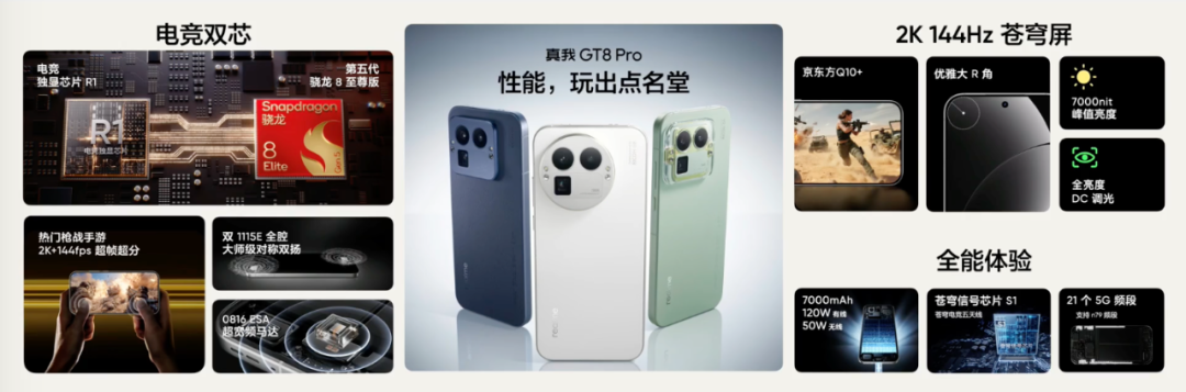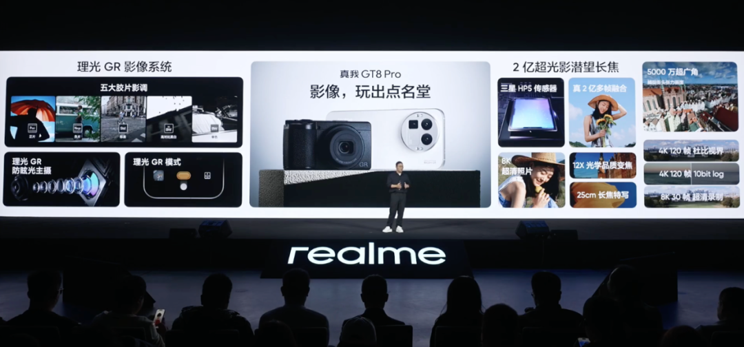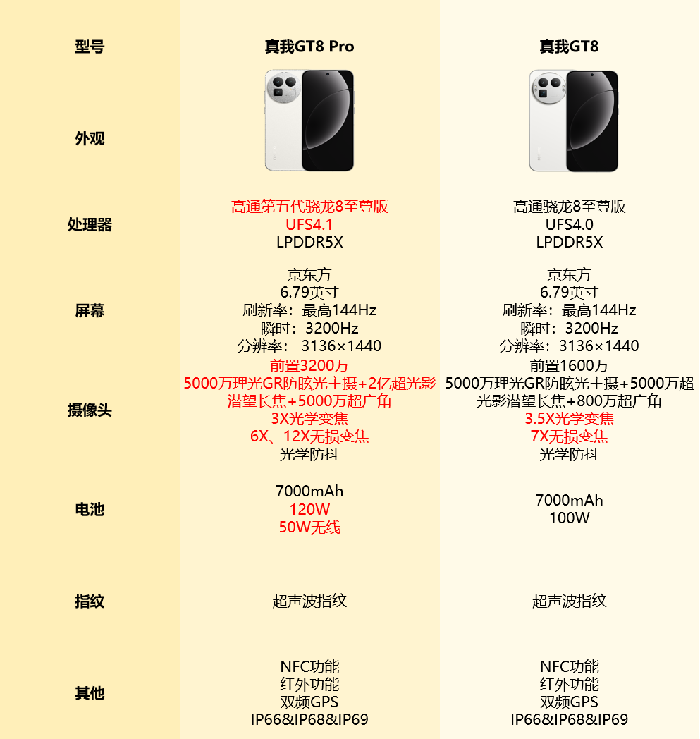 核心配置上,真我GT8 Pro前置32MP,后置三摄①50MP理光GR防眩光主摄有OIS ②50MP超广角 ③200MP潜望长焦有OIS(3X光变,最高120X数码变焦),骁龙8 Elite Gen5处理器,电竞独显芯片R1,7000mm² VC散热,7000mAh电池,120W有线充电,50W无线充电,支持NFC、红外遥控、双频GPS、X轴马达、IP66+IP68+IP69防尘防水,大师级对称双扬(双1115E全腔对称结构),首发苍穹信号芯片S1,realme UI7.0等。
