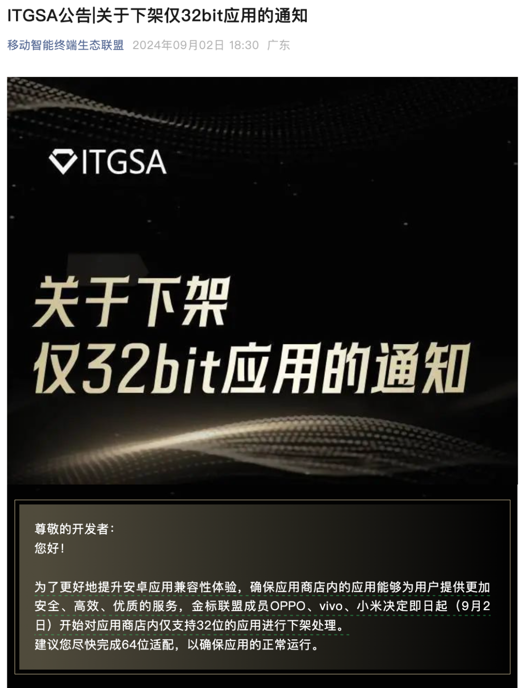 如上图所见,通知显示:为了更好地提升安卓应用兼容性体验,确保应用商店内的应用能够为用户提供更加安全、高效、优质的服务,金标联盟成员 OPPO、vivo、小米决定即日起(9月2日)开始对应用商店内仅支持32位的应用进行下架处理。建议您尽快完成64位适配,以确保应用的正常运行。