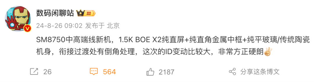 如上图所见,今日数码闲聊站爆料了疑似一加Ace系列新机的配置,从其暗示来看,这款新机应该是一加Ace5 Pro(或Ace4 Pro,最终命名以官方为准),将搭载代号为SM8750的骁龙8 Gen4处理器,这次外观ID变动比较大,整体机身方正硬朗风格,采用1.5K分辨率的BOE X2纯直屏、纯直角金属中框,背部后盖则是纯平玻璃和传统陶瓷机身,衔接过渡处有倒角处理。