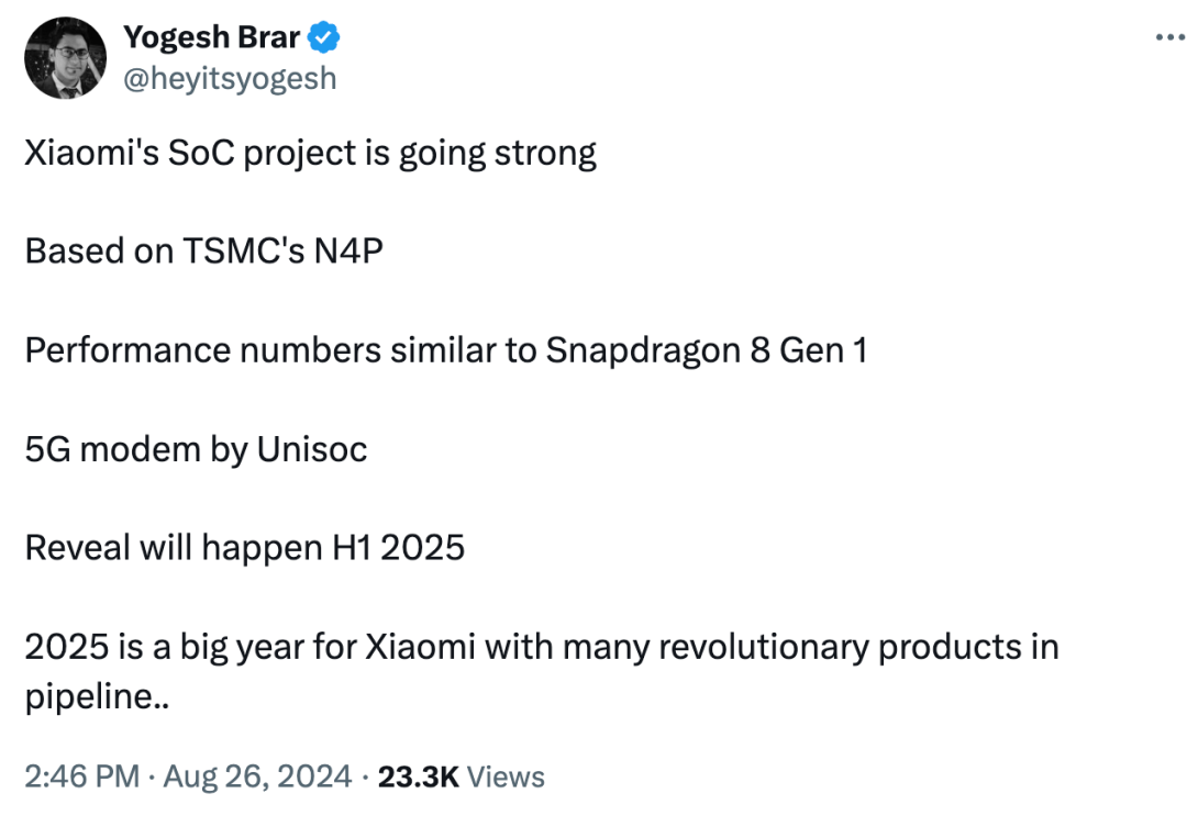 如上图所见,爆料达人Yogesh Brar发文称:小米的SoC项目进展顺利,将基于台积电N4P工艺,性能和高通骁龙8 Gen1相似,或使用紫光展锐的5G调制解调器,预计会在2025上半年亮相。并称“2025年对小米来说是重要的一年,许多革命性的产品正在筹备中”。