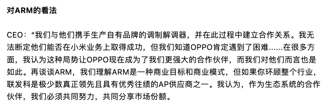 作为补充,今年2月联发科CEO蔡力行曾表示联发科有和ARM建立合作关系、携手生产自有品牌的调制解调器,并透露小米与ARM正在合作打造自研应用处理器(AP)。并称无法断定小米能否在与ARM合作的自研芯片业务上取得成功,但知道OPPO肯定遇到了困难...目前更多细节有待进一步消息。大家看好小米的SoC吗?