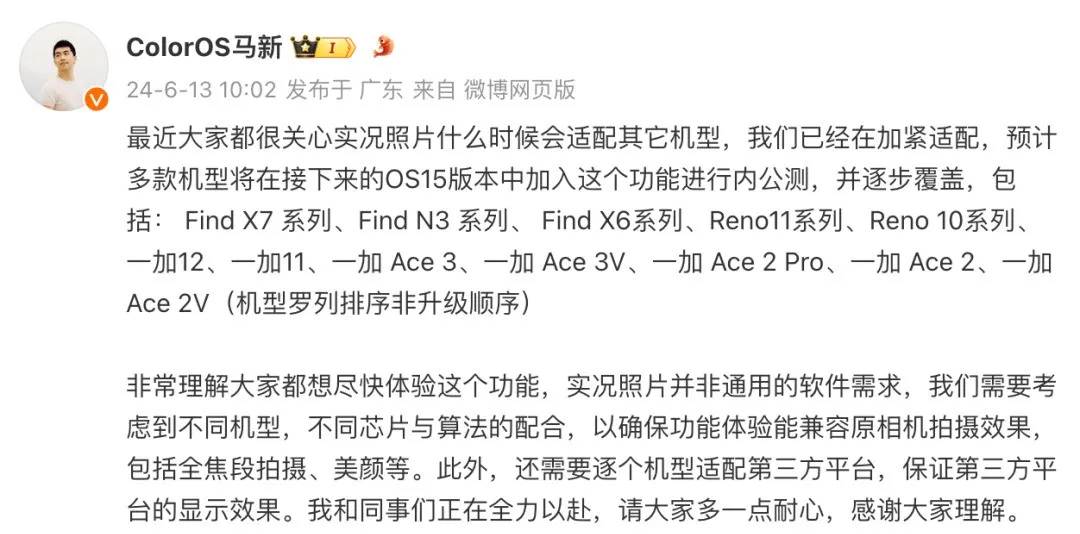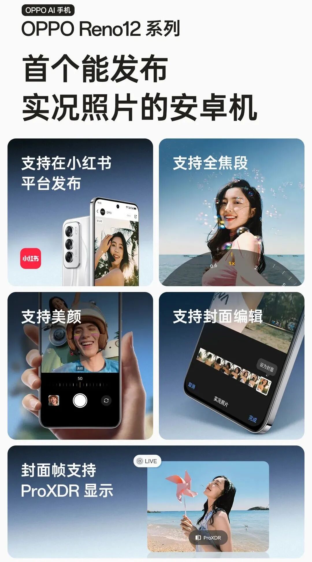具体关于实况照片,这里做个“前情”补充:今年5月,OPPO发布了Reno12系列,主打是首个能发布实况照片的安卓机,并支持在小红书平台发布和显示。随后发布的一加Ace3 Pro也支持。其它机型目前则是预告将在ColorOS15版本下加入公测、并逐步覆盖。