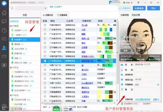我们通过“基本属性”、“购买能力”,“行为特征”、“社交网络”、“心理特征”和“兴趣爱好”等5个维度来分析用户,每个维度都对应了一定的标签,而这种情势下就可以借助鱼塘软件的“粉丝画像”功能来打上标签,如“当天跟进”、“婚纱摄影行业”、“渠道来源于婚纱摄影展”等进行用户画像。