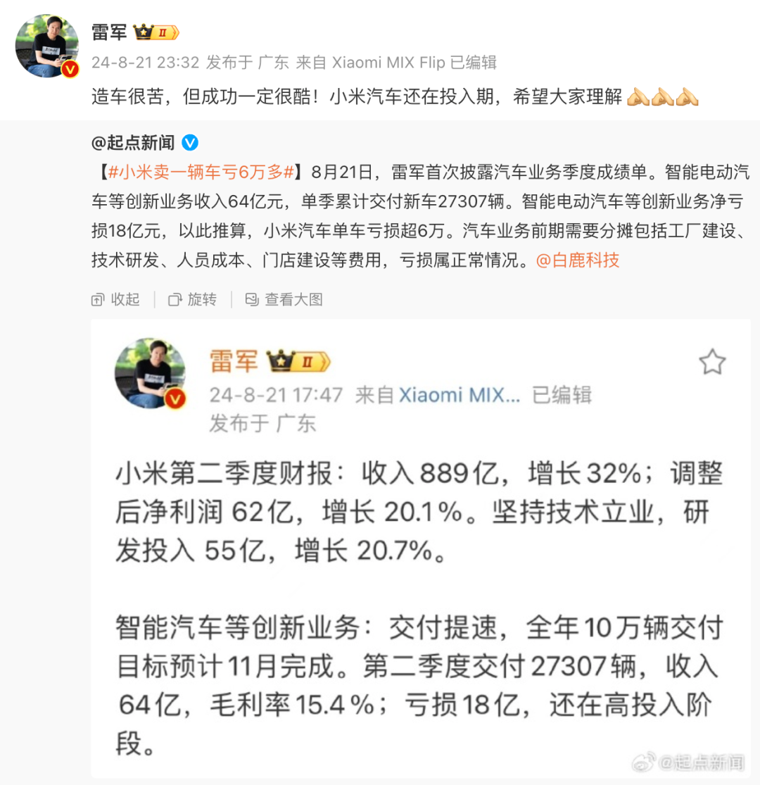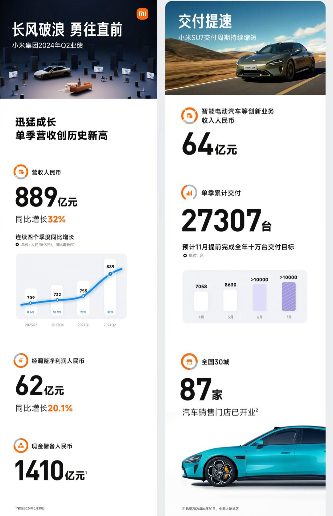 财报显示:小米集团2024Q2总收入889亿元,同比增长32.0%。经调净利润62亿元,同比增长20.1%。其中智能汽车等创新业务第二季度交付27307辆,收入64亿,毛利率15.4%;雷军称“亏损18亿,还在高投入阶段。”