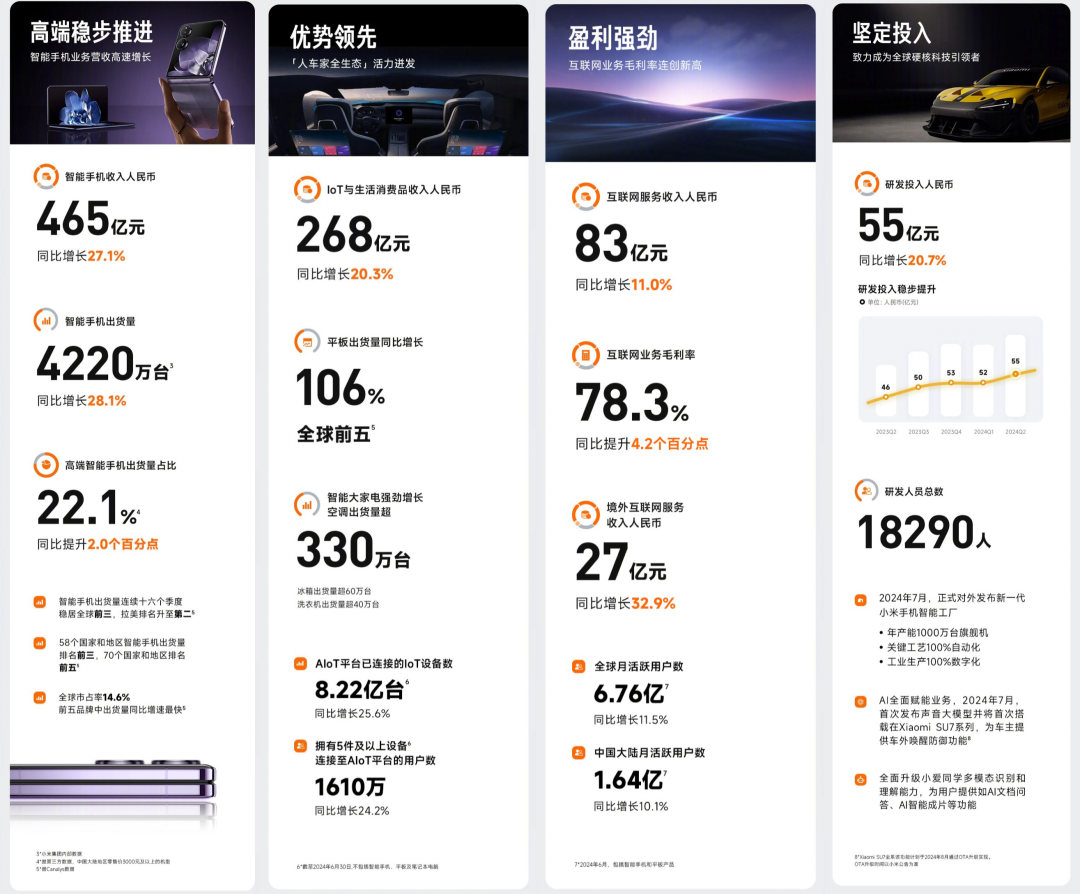 至于其他业务,财报显示2024Q2小米智能手机收入465亿元,同比增长27.1%;智能手机出货量4220万台,同比增长28.1%;中国大陆高端智能手机出货量占比达到22.1%,同比提升2%。其中4K-5K元价位段市占率20.1%,同比提升3.5%;IoT与生活消费品收入268亿元,同比增长20.3%;平板出货量同比增长106%、位列全球前五;空调出货量超330万台;互联网业务毛利率连创新高。等等。大家觉得小米过去几个月表现如何?