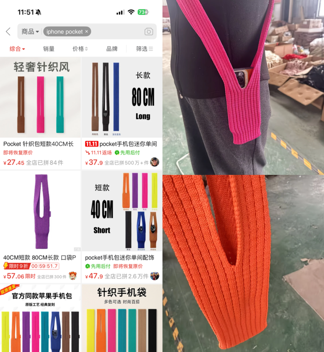 与此同时,电商平台也有不少第三方的iPhone Pocket仿品,售价在30-60元左右,部分为手工编织预售,发货需要一定周期。大家如何评价这个产品?