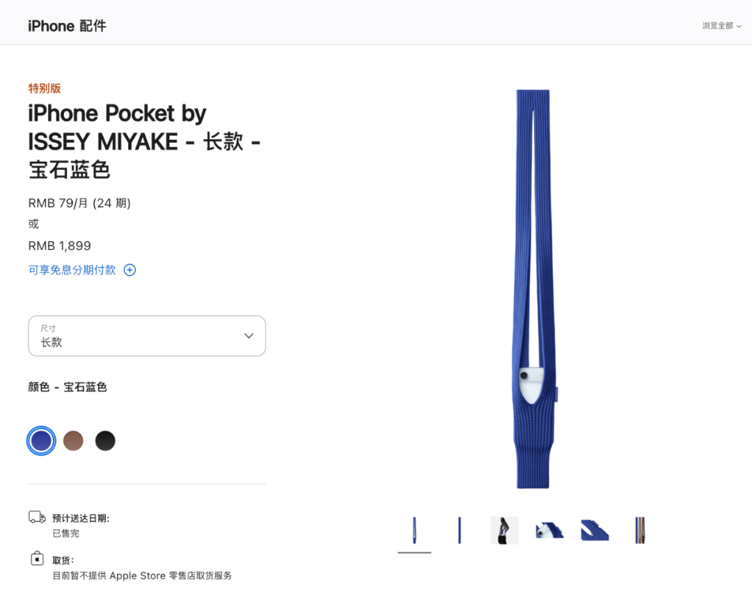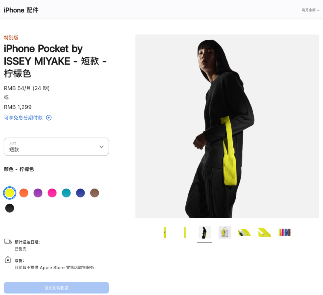 官方介绍其是和ISSEY MIYAKE(三宅一生)品牌合作的限量款,采用3D针织工艺、罗纹网状结构、弹性好,可以放iPhone或者收纳其它随身小物。昨日这款配件正式开售,没想到现在官网已经售罄。