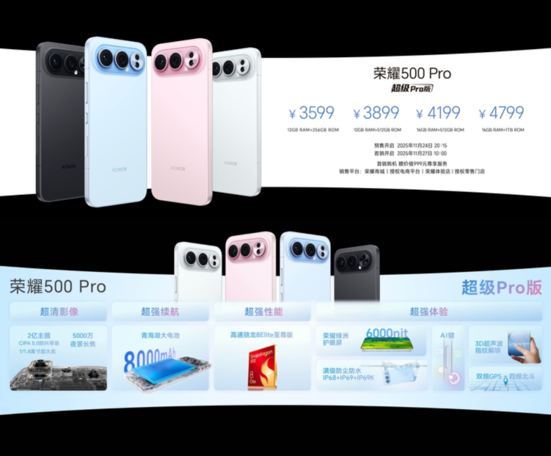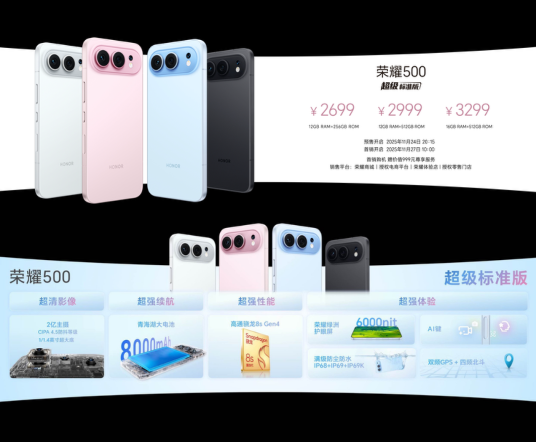 价格上,【荣耀500】12+256GB版售价2699元,12+512GB版2999元,16+512GB版3299元,昨日已开启预售,11月27日10点正式开售。