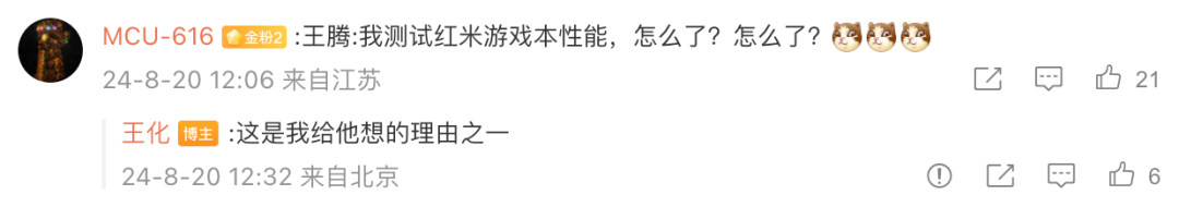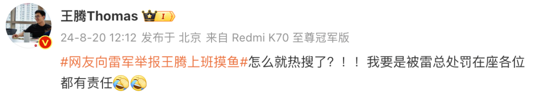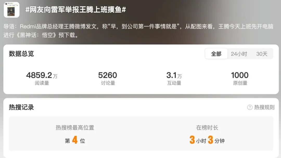 雷军称:这两天有个游戏《黑神话:悟空》特别特别火,热搜一直霸榜,自己主要在出差所以一直没玩。很多人跟我投诉王腾(上班摸鱼下载黑猴),(他不是说测试游戏本吗?)幸好我们有游戏本,要不就没这个理由了。(无论是真的测试还是在玩)其实都还好,小米是一个很宽松的氛围。大家都玩了吗?