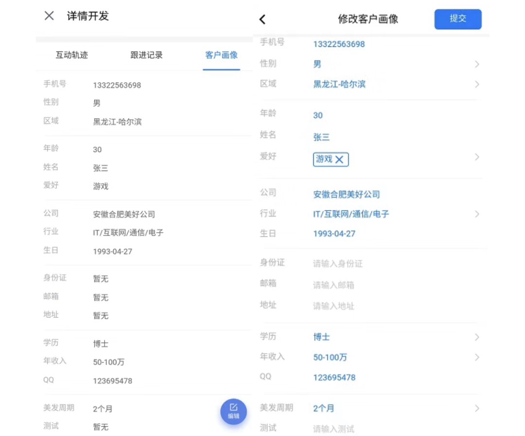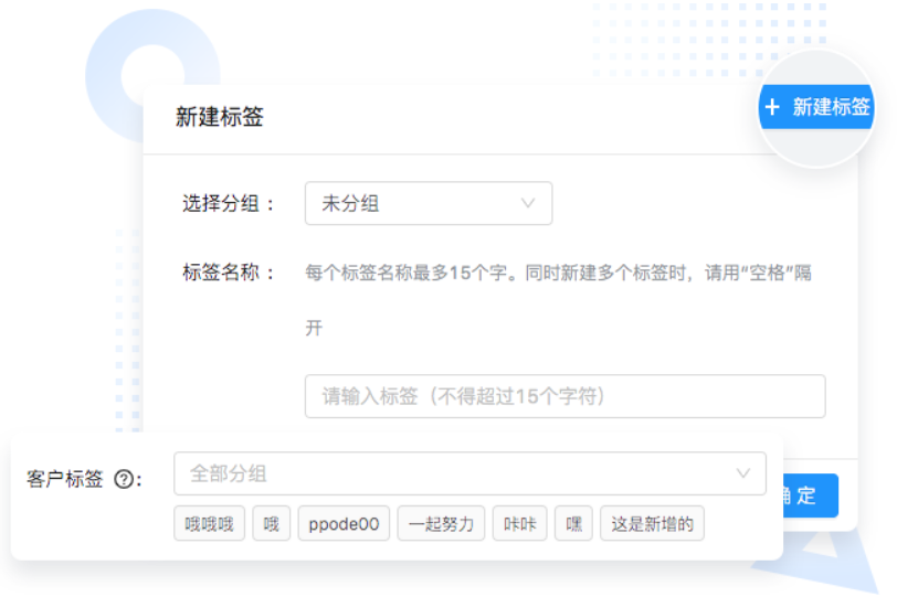在与客户沟通过程中,了解客户情况需求,自定义客户属性,构建精准用户画像进一步为后期制定个性化营销策略做准备。这个客户属性面板可以直接展示在聊天侧边栏,一边与客户聊天,一边能同步完善客户资料,查看互动轨迹、标签及跟进情况。