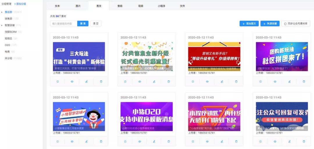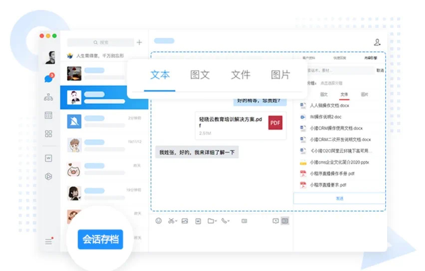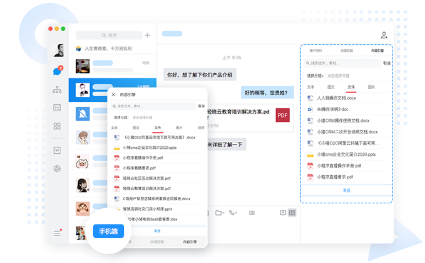 能同步展示聊天侧边栏的除了客户属性详情,还可以有自行组织的内容引擎,建立企业标准的文本销售话术。内容引擎里按照产品、行业、业务、部门等对内容进行分类存储管理,员工可以按需搜索,提供各类图片、文字、音频、视频、小程序及文件等多种素材,支持帮助员工更加精准的回复客户的问题。