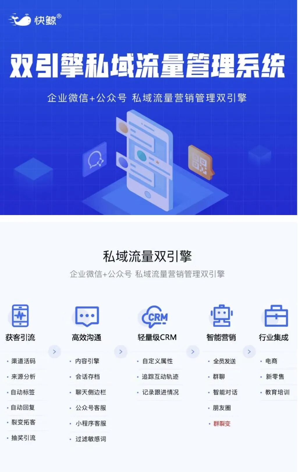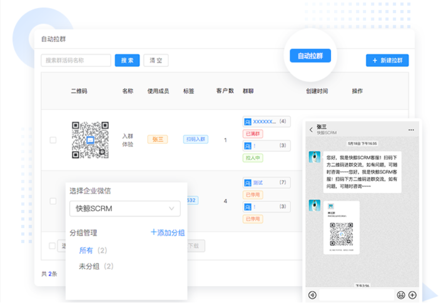 快鲸SCRM是基于企业微信和公众号开发的双引擎私域流量管理工具,涵盖企业微信SCRM、拓客裂变、营销活动、渠道二维码、群裂变、公众号管理、公众号客服、会话存档、小程序客服、话术内容管理等应用,并且深耕电商行业,打通了有赞和天猫淘宝等电商平台,直接通过企业微信即可做电商私域流量。了解试用可以扫下面二维码咨询。