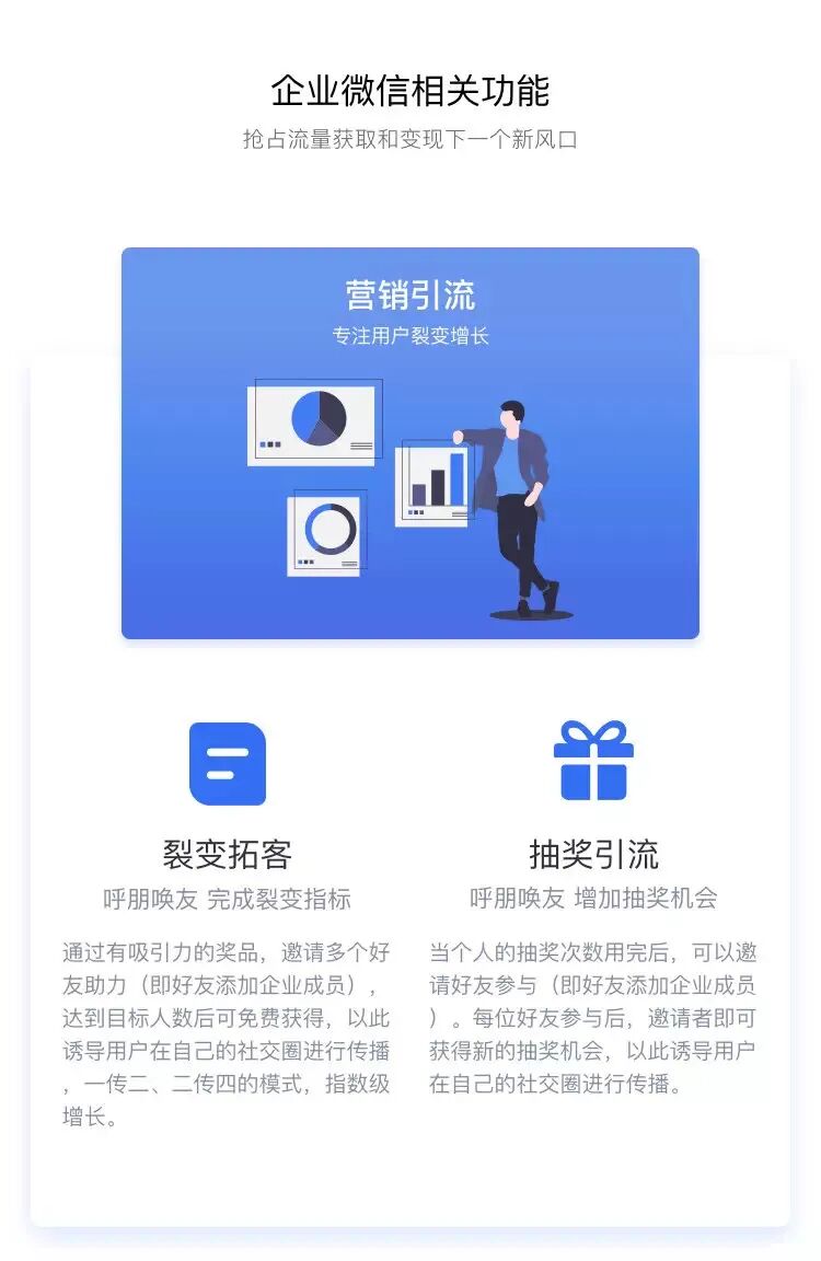 此外,企业微信官方对于企业微信的定位可以允许它在一定范围内,做一些商业营销的行为,不容易被封号。所以企业可以配合裂变拓客、抽奖引流、红包裂变等方式,吸引客户在自己的社交圈内进行传播,实现一传二、二传四的指数级增长,形成完整私域流量扩展沉淀的完整闭环。