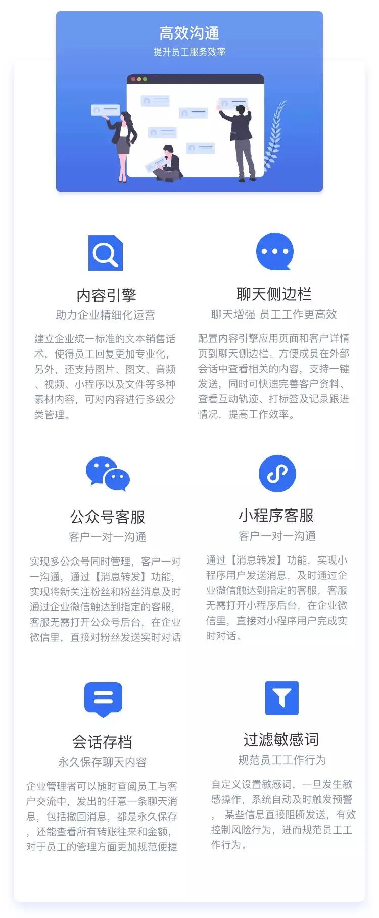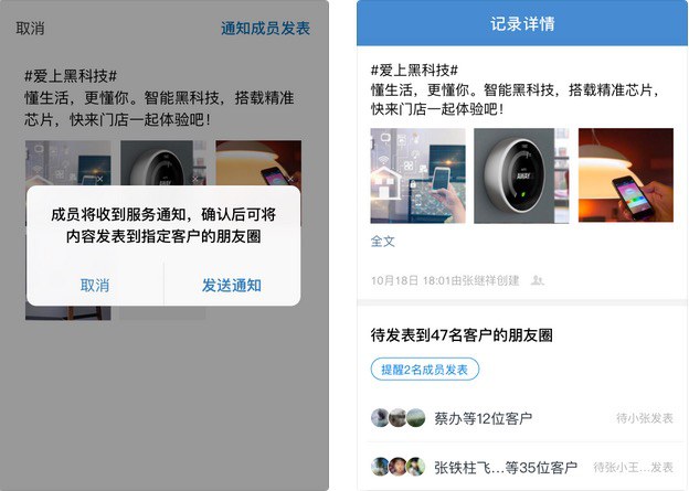 为了更好规范员工服务,一些敏感词可以提前自定义设置,员工若有触发,敏感词过滤功能可以帮助阻断发送,有效控制风险行为,规范员工行为。同时企业还可以为员工准备统一的朋友圈物料,对企业员工朋友圈进行规范化管理及互动反馈追踪,长期稳定分享专业内容塑造企业形象。