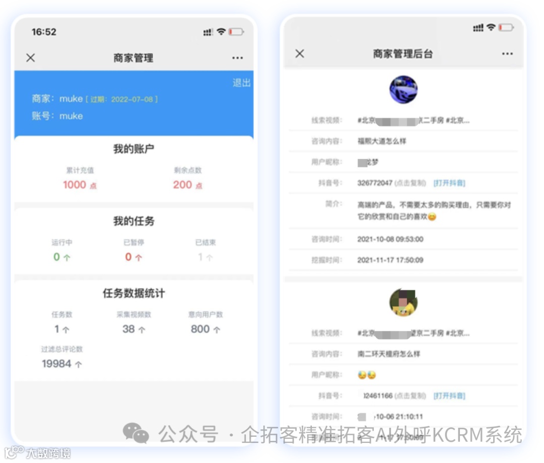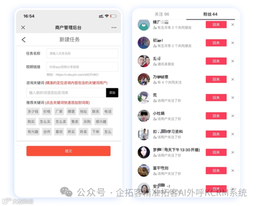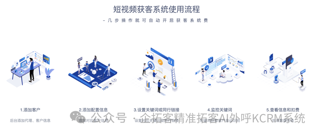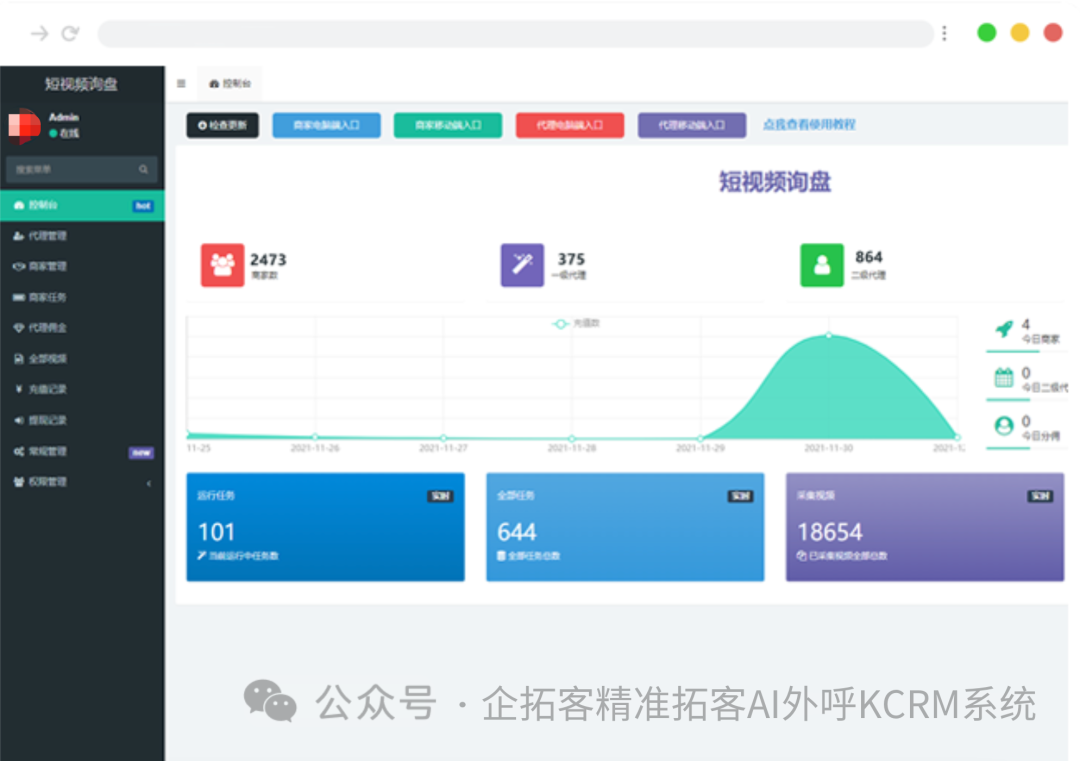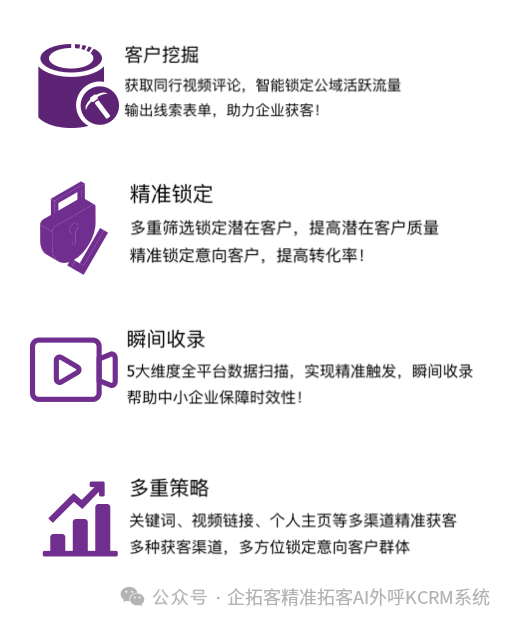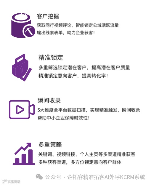 企拓客短视频询盘获客系统是用AI人工智能技术覆盖主流的5大短视频平台,通过关键词、视频链接、个人主页等多渠道精准获客,多方位锁定意向客户群体。通过精准关键词采集同行客户信息,多维度锁定精准用户评论者的咨询拓客,输出线索表单然后通过AI外呼语音机器人和人工呼叫中心联系客户。