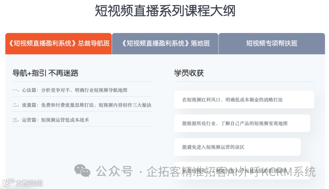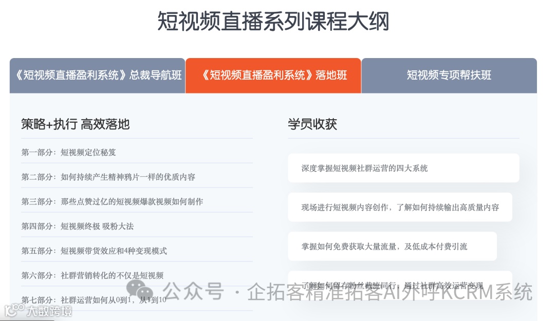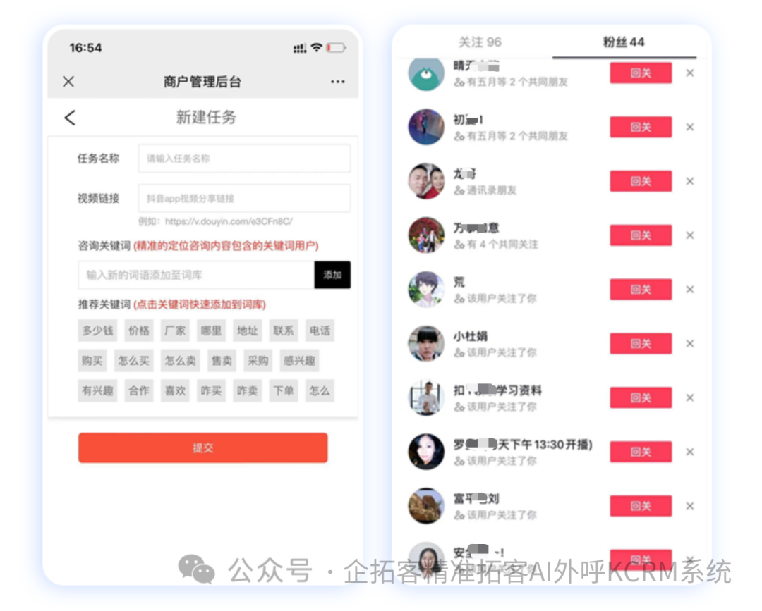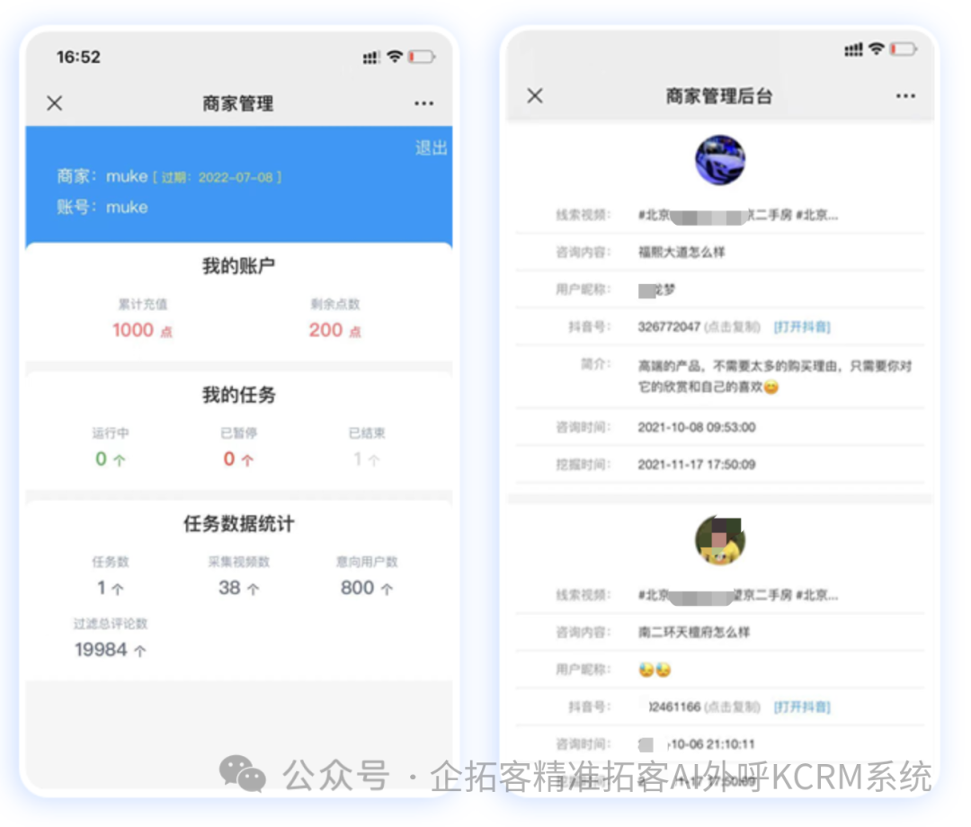 企拓客短视频询盘获客系统是用AI人工智能技术覆盖主流的5大短视频平台,通过关键词、视频链接、个人主页等多渠道精准获客,多方位锁定意向客户群体。通过精准关键词采集同行客户信息,多维度锁定精准用户评论者的咨询拓客,输出线索表单然后通过AI外呼语音机器人和人工呼叫中心联系客户。