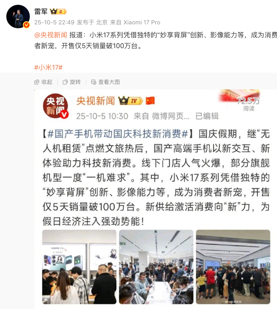 9月25日,小米发布了全新小米17系列,带来了小米17、小米17 Pro、小米17 Pro Max三款新机,已于9月27日上午正式开售,10月2日,卢伟冰宣布小米17系列目前销量已超过100万台,现在关于小米17系列的市场表现有进一步消息。如上图所见,昨日晚间小米雷军引用了央视新闻报道,再度表示「小米17系列凭借独特的“妙享背屏”创新、影像能力等,成为消费者新宠,开售仅5天销量破100万台。」另外爆料达人数码闲聊站暗示小米17系列的激活量也已经超过100万台。不知道这波大家有没有入手小米17系列的?历史资讯