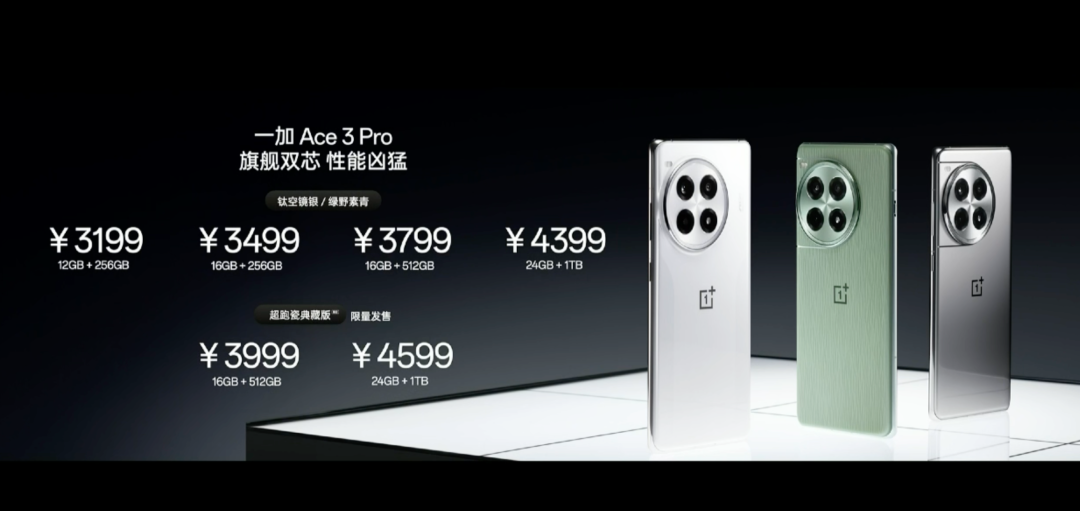 价格上,一加Ace3Pro【素皮/玻璃版本】12+256GB售价3199元,16+256GB售价3499元,16+512GB版3799元,24GB+1TB版4399元;【超跑陶瓷典藏版限量发售】16+512GB版售价3999元,24GB+1TB版售价4599元。这个价格你觉得怎么样?