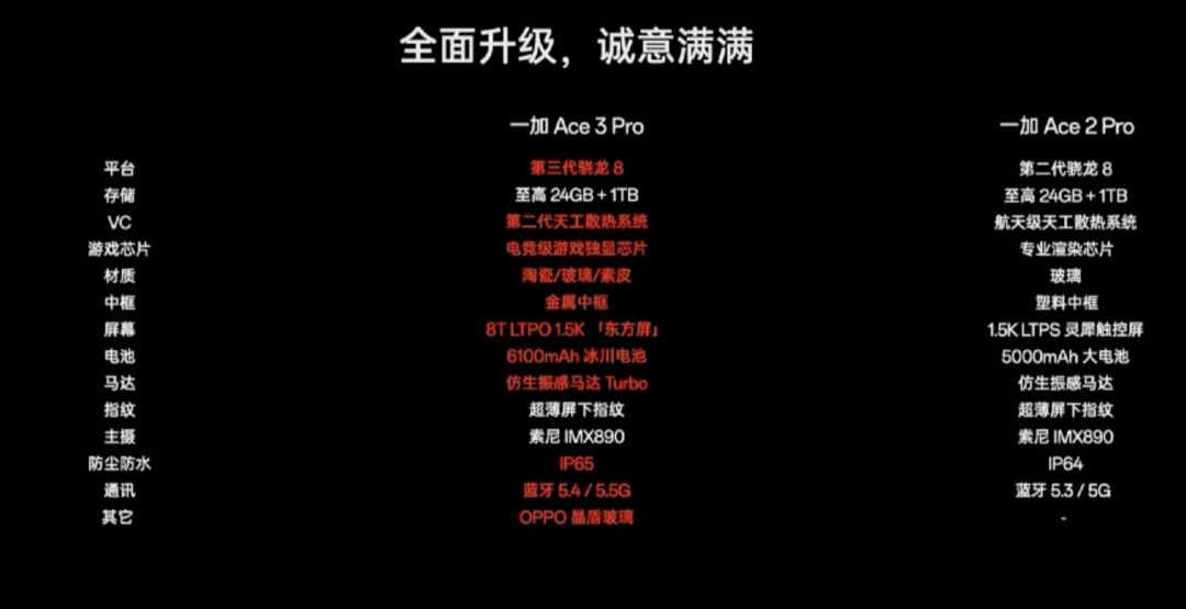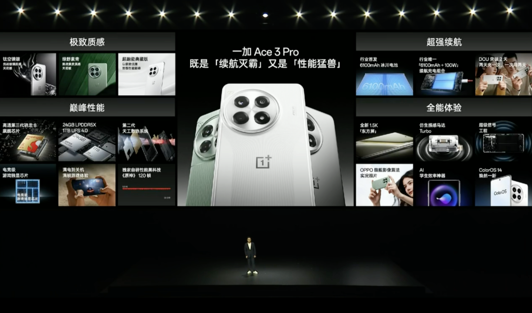 核心配置上,一加Ace3 Pro搭载骁龙8 Gen3处理器,LPDDR5X、UFS 4.0,第二代天工散热系统,9126mm² VC散热,行业首发「2K超临界导热石墨」;电竞级游戏独显芯片、独家自研性能黑科技,号称安卓首发《原神》120帧;首发搭载6100mAh冰川电池,100W有线充电;前置16MP,后置三摄①50MP主摄有OIS ②8MP超广角 ③2MP微距,支持多功能NFC、红外遥控、双频GPS、立体双扬声器、IP65级防尘防水,定制升级款超大X轴线性马达(仿生振感马达Turbo),支持拍摄实况照片并在小红书发布等等。