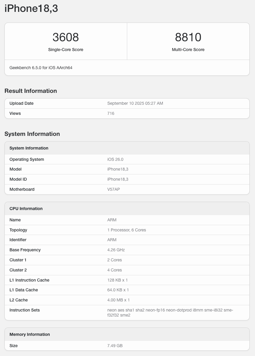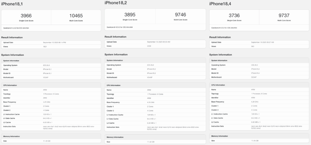 而iPhone Air、iPhone 17 Pro、iPhone 17 Pro Max三款新机的Geekbench 6跑分来看,目前CPU单多核成绩最高的是代码为iPhone18,1的设备,单多核3966/10465;GPU成绩最高的是代码为iPhone18,2的设备,Metal跑分达到45657。作为参考,iPhone 16 Pro系列搭载的A18 Pro在Geekbench中CPU成绩为3500±/9000±,GPU成绩为32419。