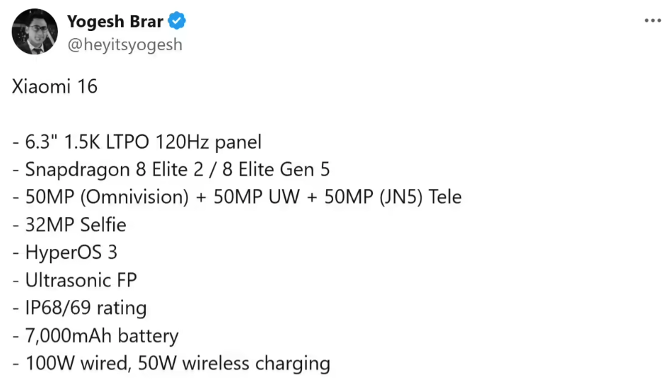 最后是小米16系列这边的消息。今日爆料达人Yogesh Brar爆料了小米16的详细规格。