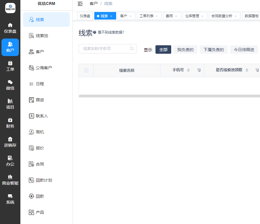 客户管理-线索,线索池,公海客户,日程,跟进,联系人,商机,报价,合同,回款计划,回款,产品,退款和售后,拜访签到。