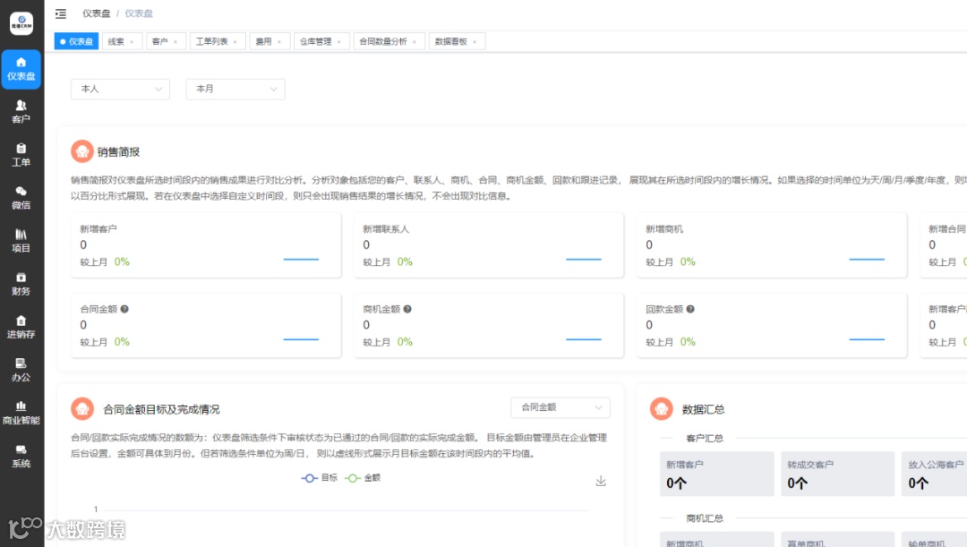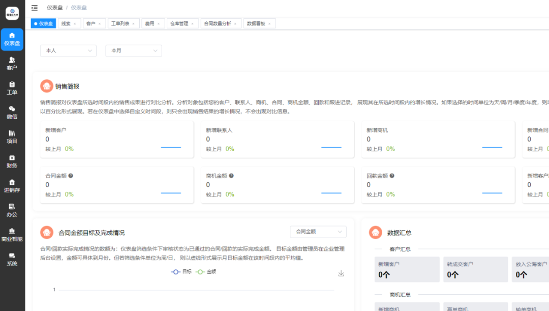 仪表盘:销售简报,合同金额目标以及完成情况,数据汇总,业绩指标完成率,销售漏斗等。