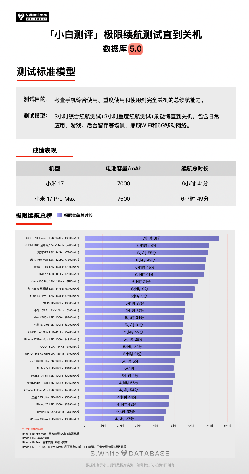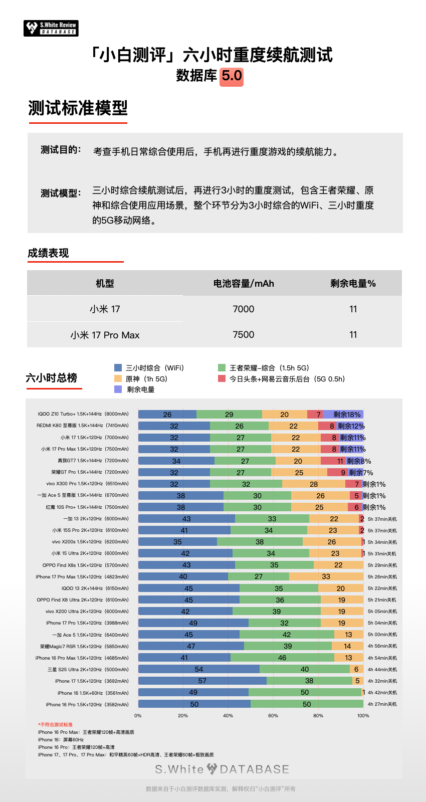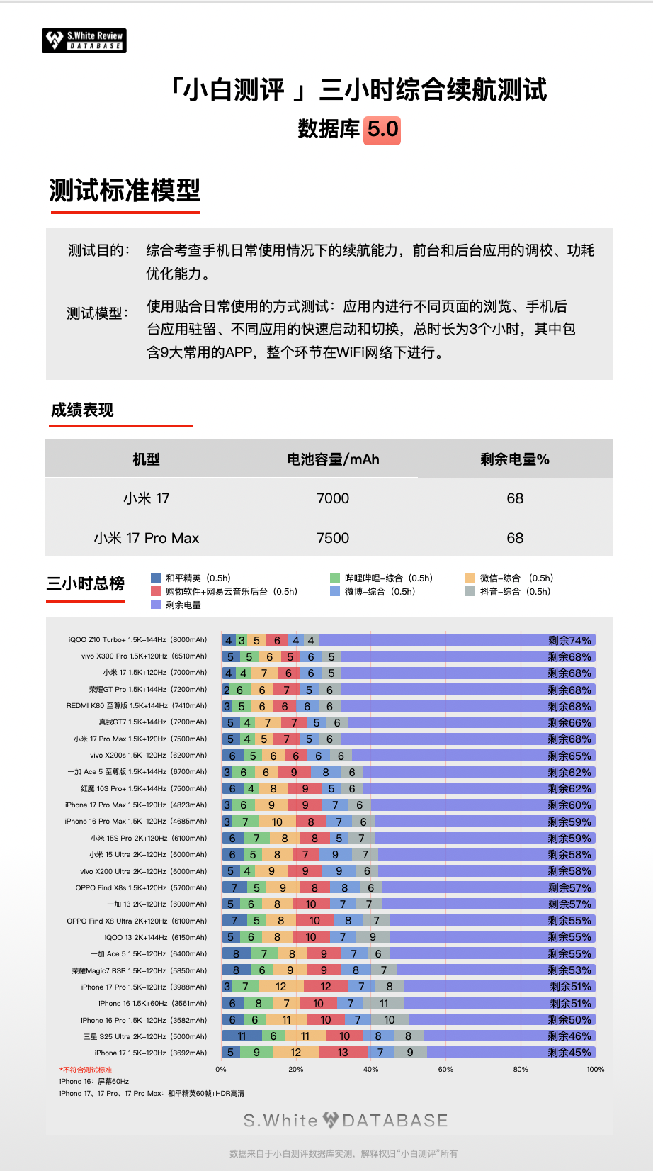 近日卢伟冰宣布小米17系列销量破100万,已经入手后的小伙伴实际续航怎么样?下面是数据库5.0模型下之前实测的小米17 Pro和小米17 Pro Max相关成绩:【小米17】在小白测评数据库5.0续航模型下三小时综合续航测试剩余电量68%,六小时重度续航测试剩余11%,极限续航测试直到关机,共坚持了6小时41分钟。【小米17 Pro Max】在小白测评数据库5.0续航模型下三小时综合续航测试剩余电量68%,六小时重度续航测试剩余11%,极限续航测试直到关机,共坚持了6小时49分钟。以上续航成绩是全程亮屏状态测试,测试项目包含应用内、后台留存、启动和切换应用、重度游戏等。基于小白测评数据库5.0模型测试,环境温25℃±0.5℃,屏幕亮度350nits,全新机械臂操作、高速相机进行数据采样<更多详细测试标准查看《数据库测试标准手册5.0》>供大家参考~历史资讯