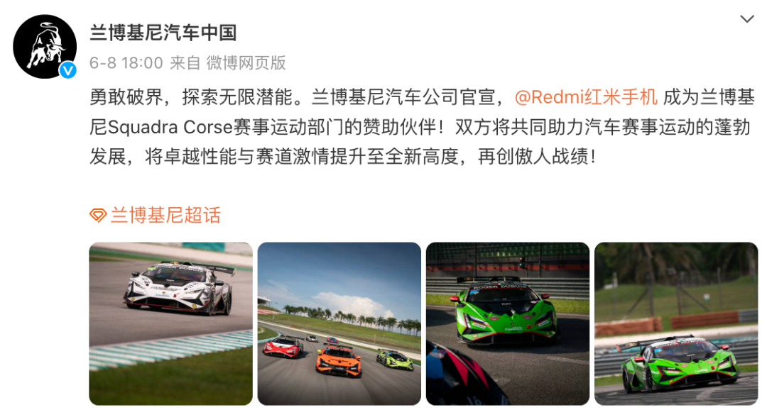比较巧合的是,近日兰博基尼汽车公司官宣Redmi红米手机成为兰博基尼Squadra Corse赛事运动部门的赞助伙伴。