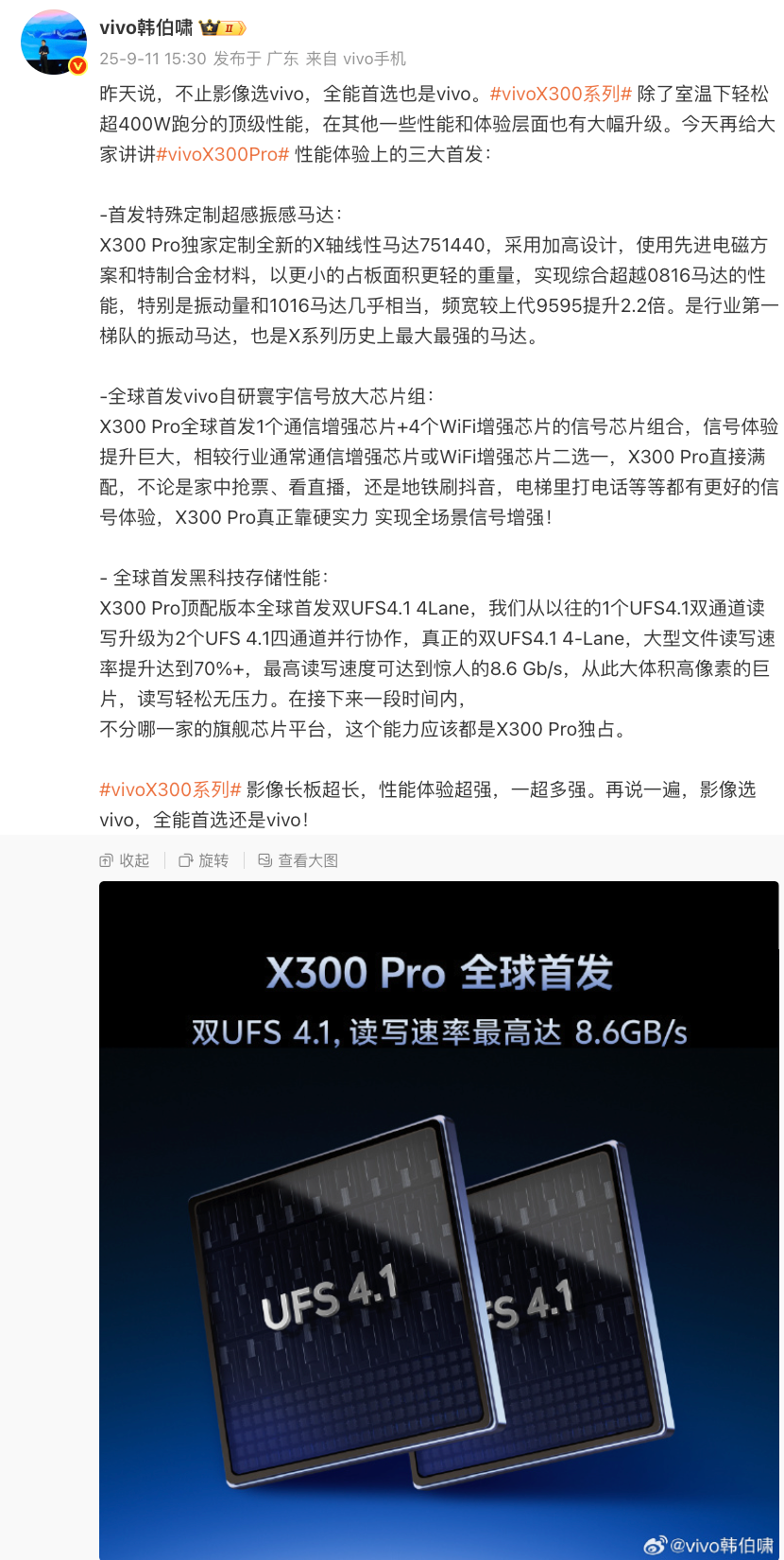 )②全球首发vivo自研寰宇信号放大芯片组(1个通信增强芯片+4个WiFi增强芯片的信号芯片组合)③全球首发黑科技存储性能:X300 Pro顶配版本全球首发双UFS4.1 4Lane。